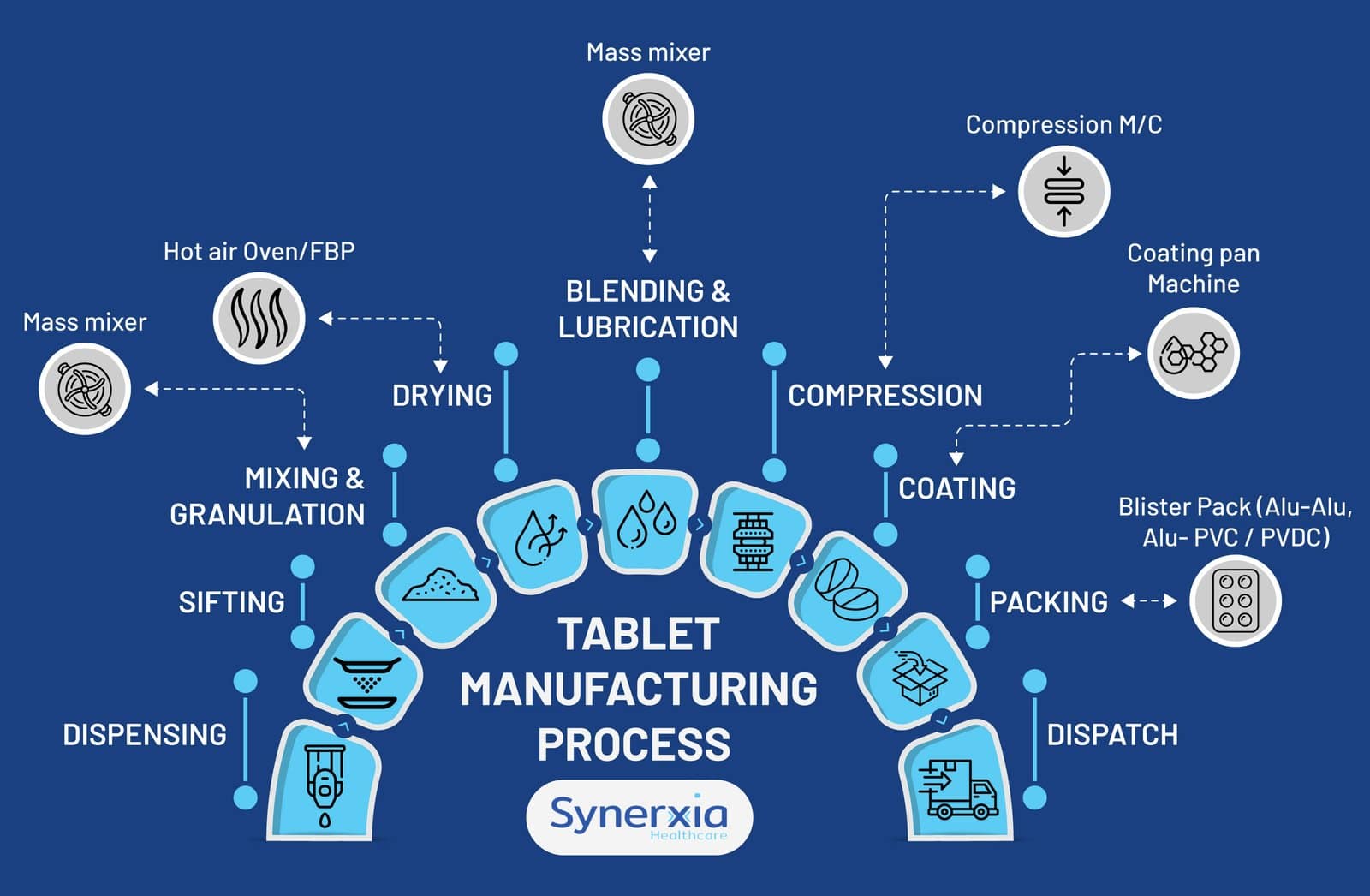 - Tablets: Compressed into solid forms using compression machines.