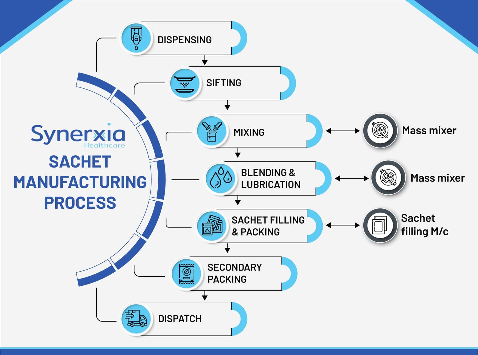 - Sachets: Filled with pre-measured doses using sachet-filling machines.